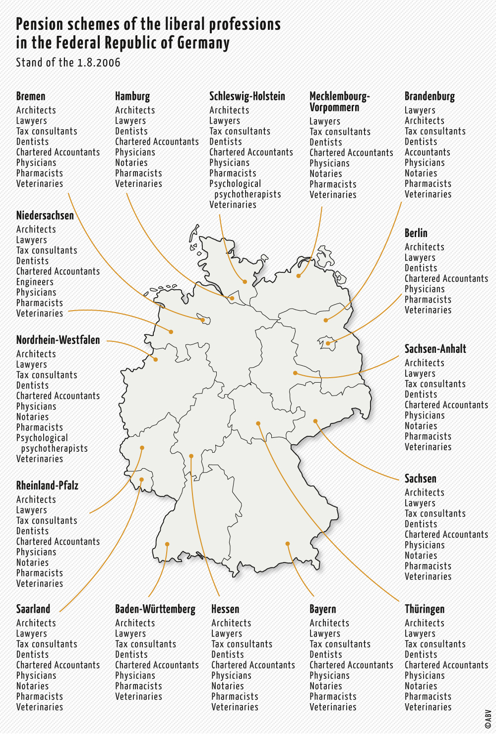 Altogether there are more than 90 professional pension schemes for the liberal professions. 89 of them are members of ABV in Cologne/Berlin, the association of pension schemes of the liberal professions.