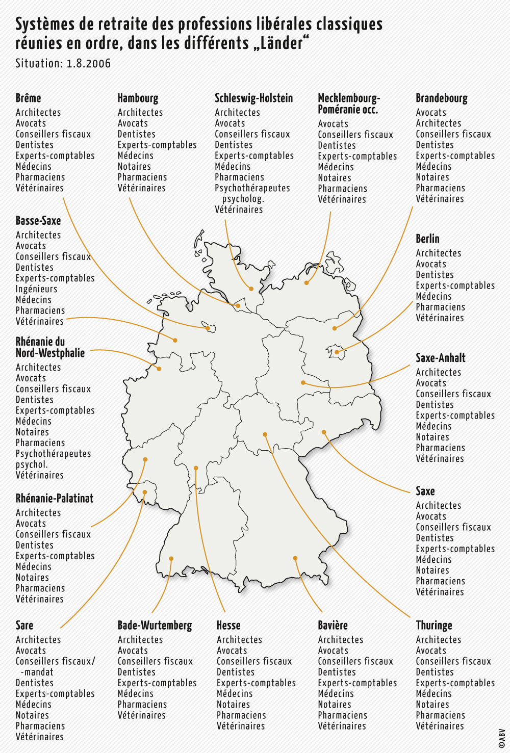 Il existe au total plus de 90 Caisses de retraite professionnelles pour les membres des professions libérales réunies en ordre, dont 89 sont membres de l’Arbeitsgemeinschaft berufsständischer Versorgungungseinrichtungen (ABV) située à Cologne/Berlin.